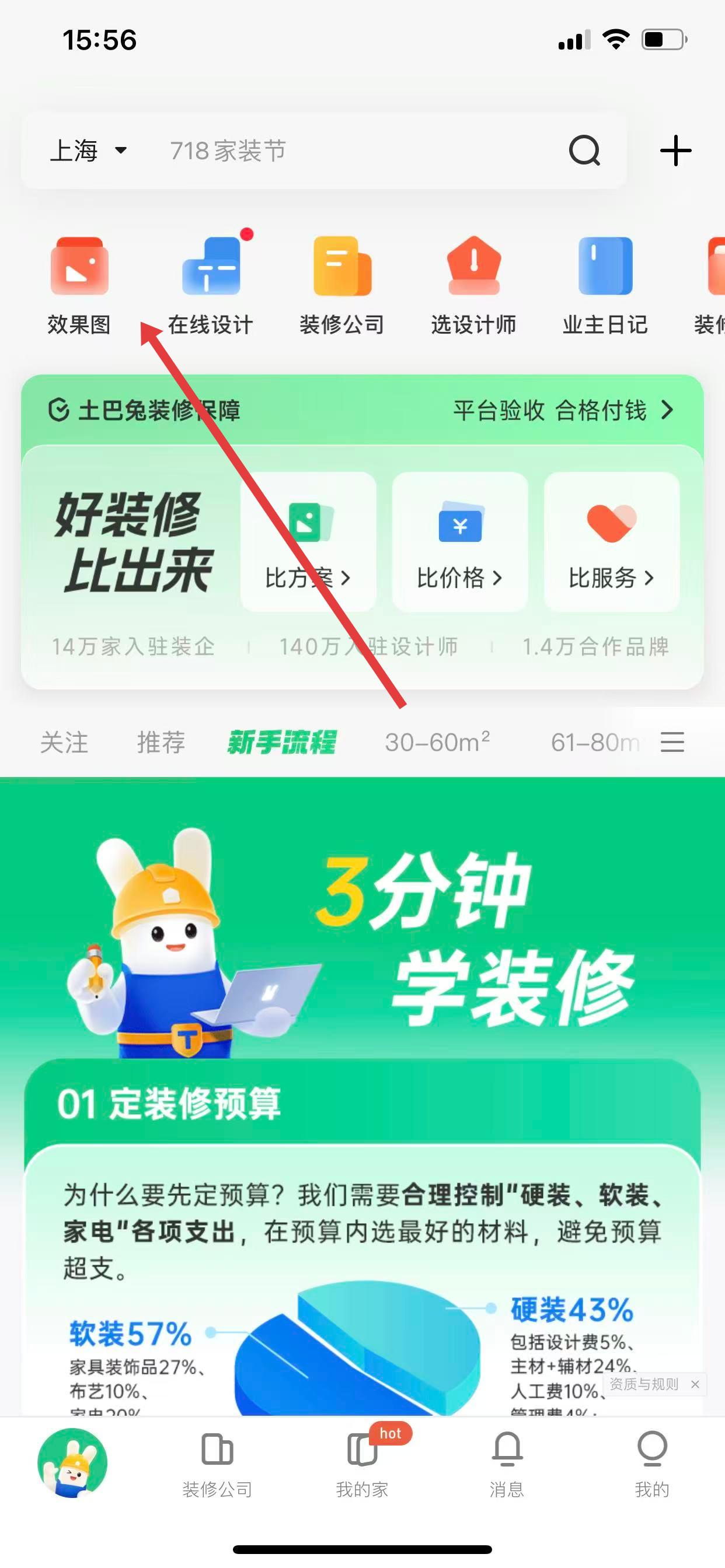 1、打开土巴兔装修App,在首页点击效果图选项。