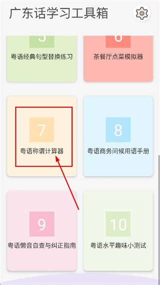 1、在学习工具箱页面,点击粤语称谓计算器,进入粤语家族称谓计算器页面。