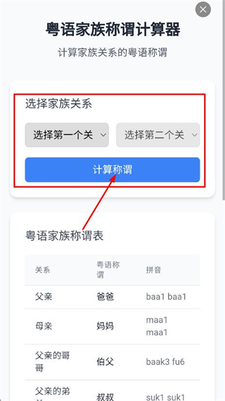 2、在粤语家族称谓计算器页面,选择家族关系选择关系后,点击计算称谓。