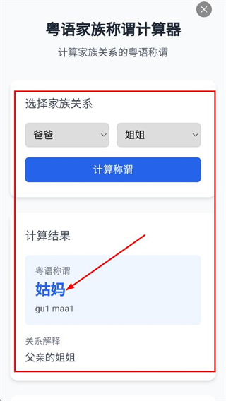 3、随后我们可以点击后,可查看计算结果粤语称谓姑妈及关系的解释。