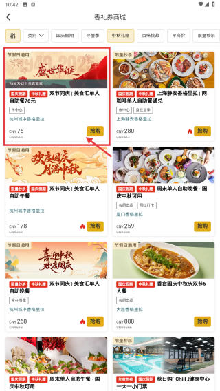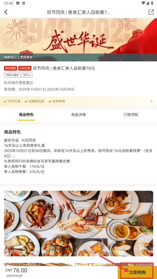 3、选择双节同庆|美食汇单人自助餐76元商品条目,进入商品详情页面。