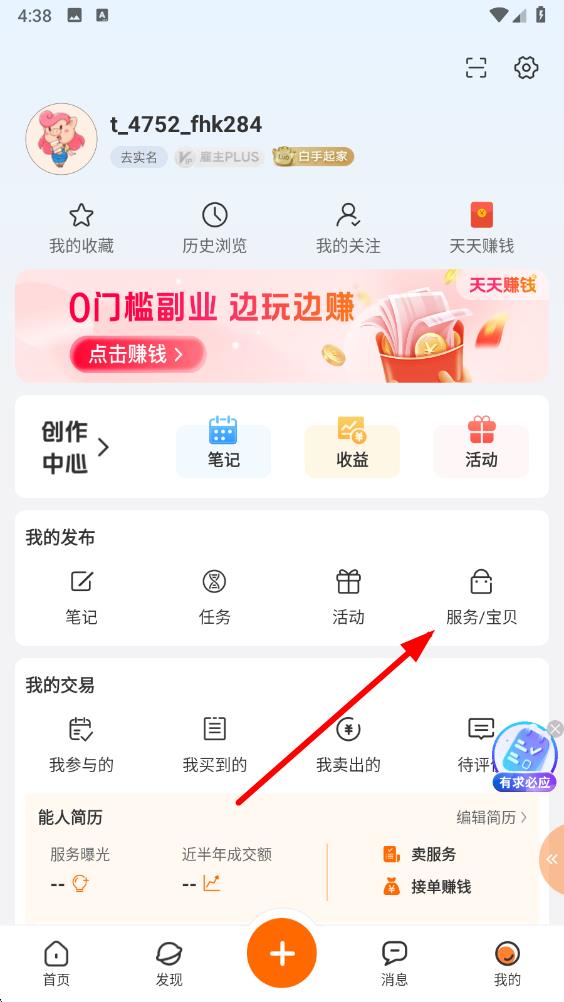 2、在个人界面中,找到并点击服务宝贝选项,进入服务管理页面。