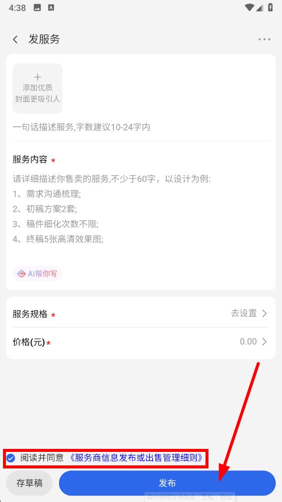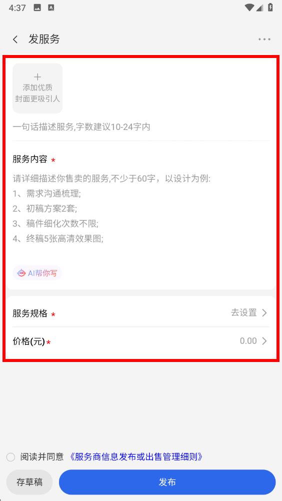 4、进入发布服务界面,添加优质封面,填写服务描述、详细服务内容,设置服务规格与价格。
