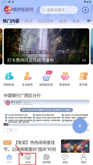 1、打开桂林生活网应用,点击底部论坛选项,进入桂林人论坛页面。