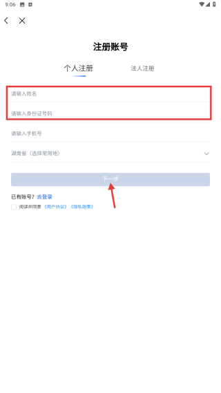 4、依次填写姓名、身份证号码、手机号等信息,点击下一步按钮,完成账号注册流程。