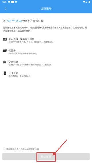 4、阅读注销说明后,勾选同意协议,点击确认注销按钮,完成账号注销操作。