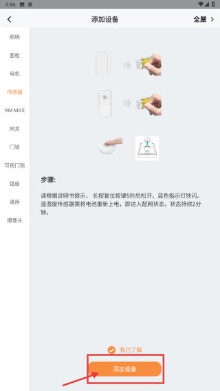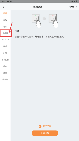 2、在设备添加页面,选择传感器分类,查看该类设备的添加步骤。