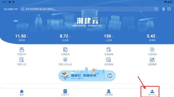 1、打开湘建云应用,点击底部用户中心选项,进入个人中心页面。