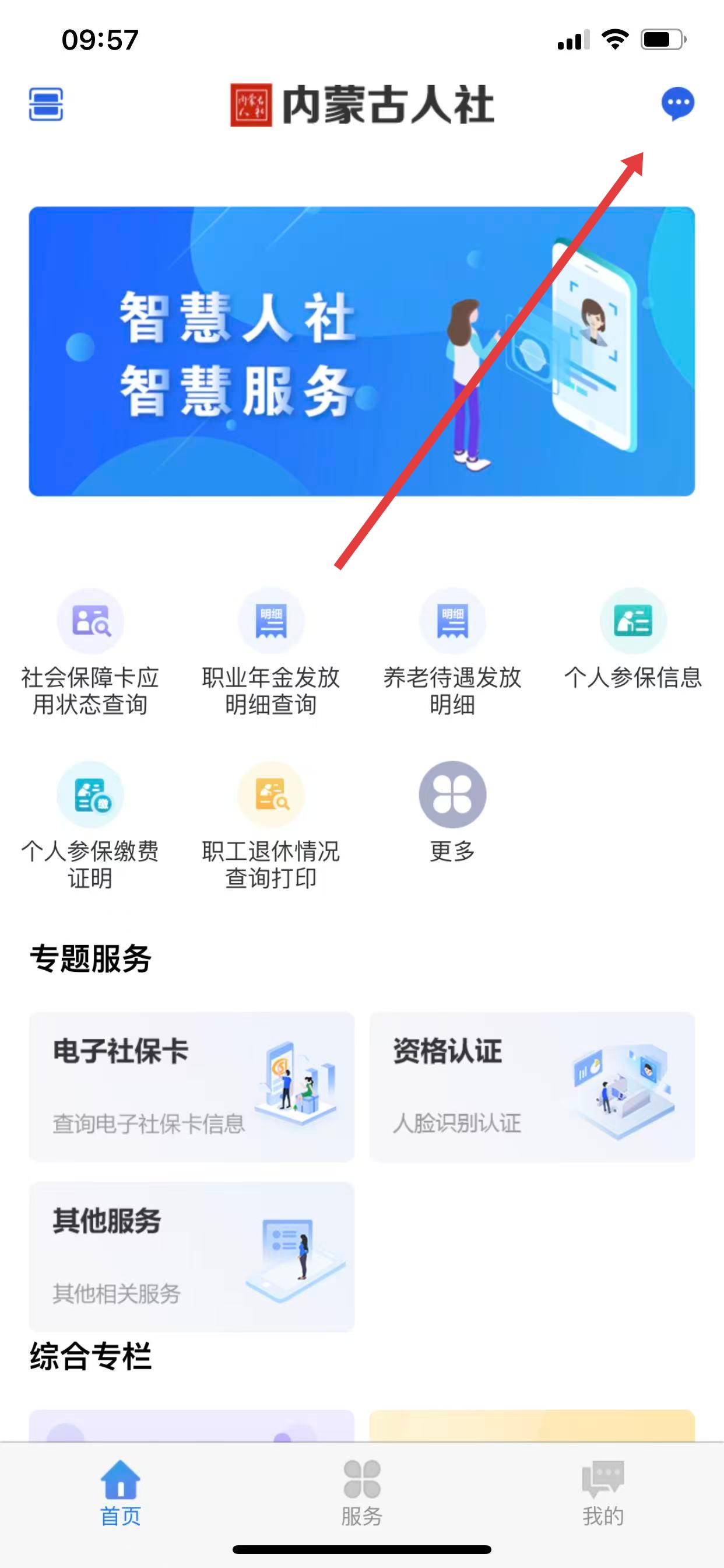 1、打开内蒙古人社App,点击首页右上角的消息图标。