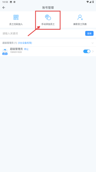 4、在账号管理界面,点击手动添加员工选项,进行员工账号添加操作。