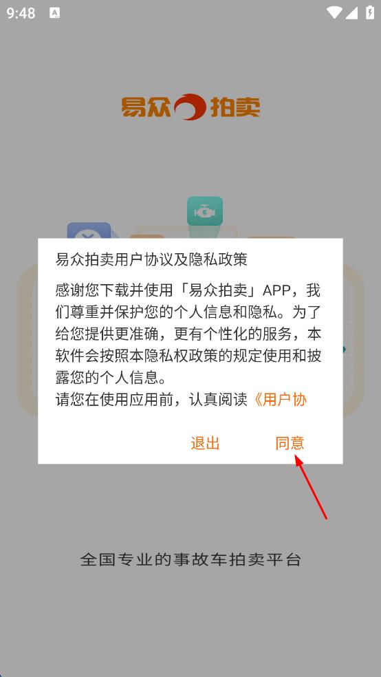 1、打开易众拍卖APP,在弹出的用户协议及隐私政策提示框中,点击同意。