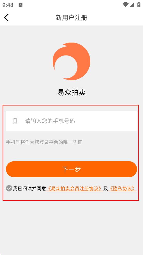 4、在新用户注册页面,输入手机号码,勾选同意相关协议,点击下一步。