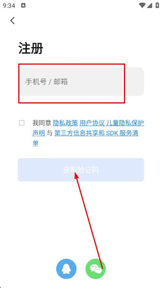 3、在注册页面,输入手机号,点击获取验证码按钮。