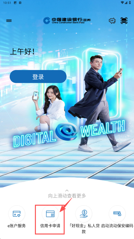 1、打开银行类应用,点击信用卡申请选项,进入信用卡申请页面。