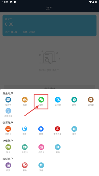 2、在资产页面,点击添加资产按钮,弹出账户类型选择菜单。