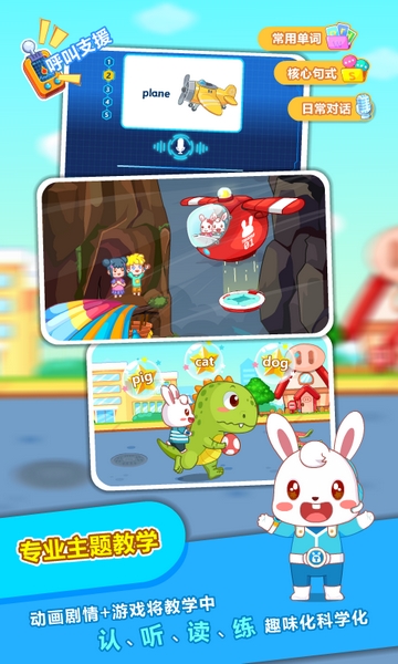 1、主线课程:精心设计的故事情节式教学,通过趣味十足的救援故事串联高频词汇、常用短语和基础句式,让孩子在情境中自然习得英语,培养英语思维和应用能力。