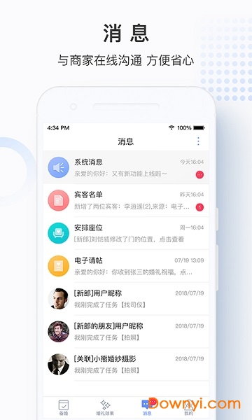 2、消息:与商家在线沟通,方便省心。平台整合了全国优质婚礼服务商,您可以直接在app内与商家进行实时沟通,获取报价、预约服务,所有交流记录都会完整保存,方便随时查阅。