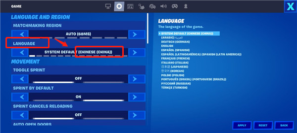 2、在设置界面的语言选项中,选择简体中文后,记得点击右下角的应用按钮才能成功保存设置。
