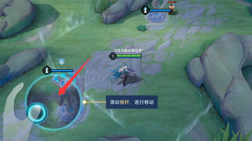 2、进入战场地图界面后,通过滑动左侧虚拟摇杆控制英雄移动方向和位置。