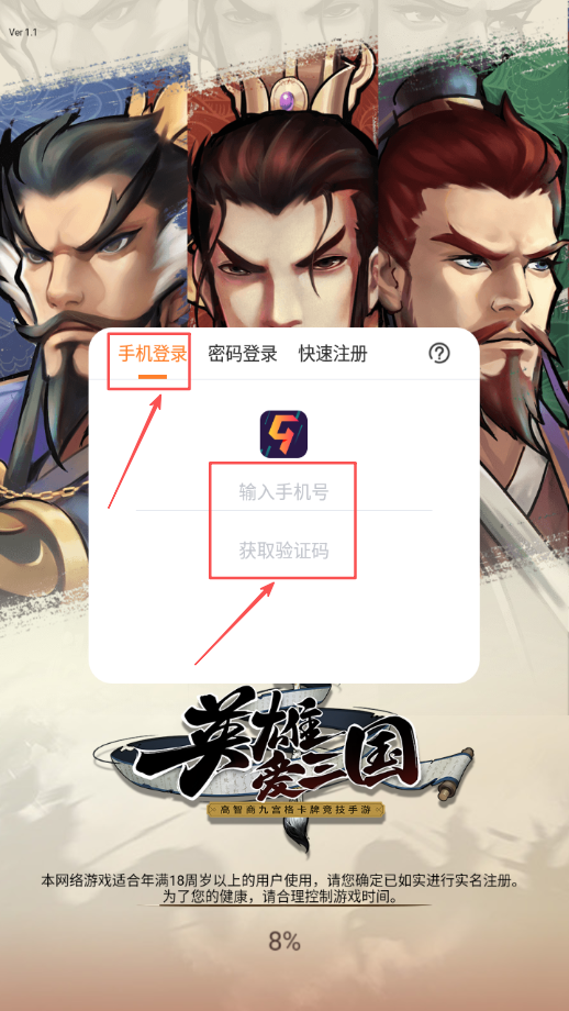 1、打开游戏后进入登录界面,选择手机号验证码登录方式获取短信完成验证。