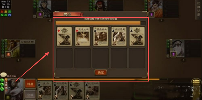 3、每位玩家都发放4张起始手牌,剩余游戏牌整齐放在桌子中央当牌堆,从主公开始按逆时针顺序轮流回合。