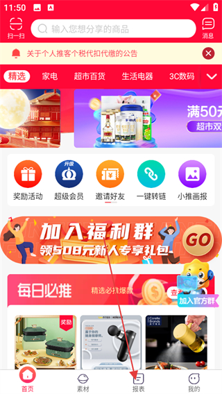 1、打开苏宁推客APP,进入首页后,点击底部导航栏中的报表选项。