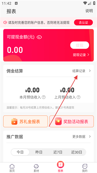 2、在报表页面,找到佣金结算板块,点击其右侧的结算记录选项。