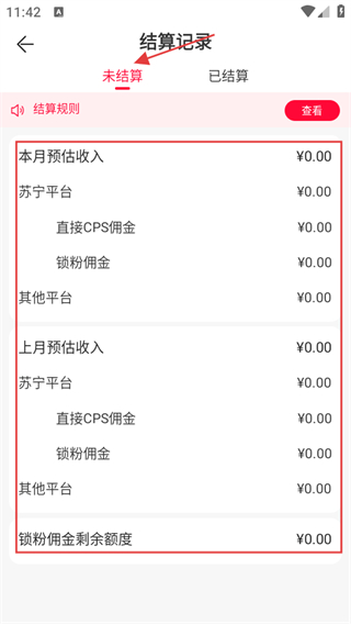 3、进入结算记录页面,可查看未结算状态下的本月预估收入、上月预估收入等相关结算数据。