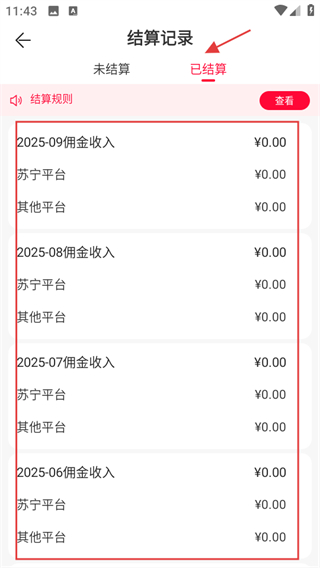 4、点击已结算选项卡,能查看不同月份平台及其他平台的已结算佣金收入记录。