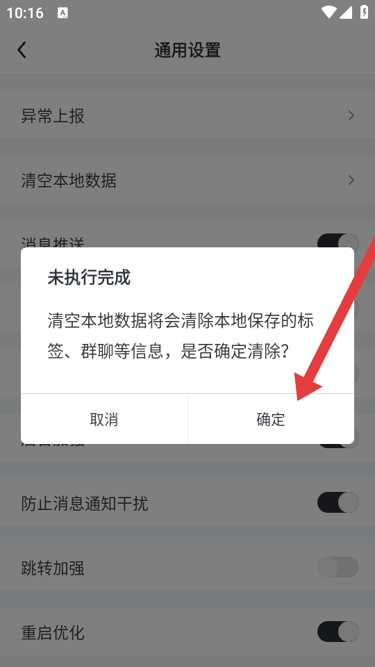 4、在未执行完成的确认弹窗中,点击确定按钮,完成本地数据清空。