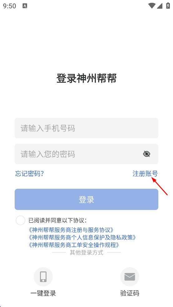 1、打开神州帮帮登录页面,点击下方账号密码选项,进入账号密码登录界面。