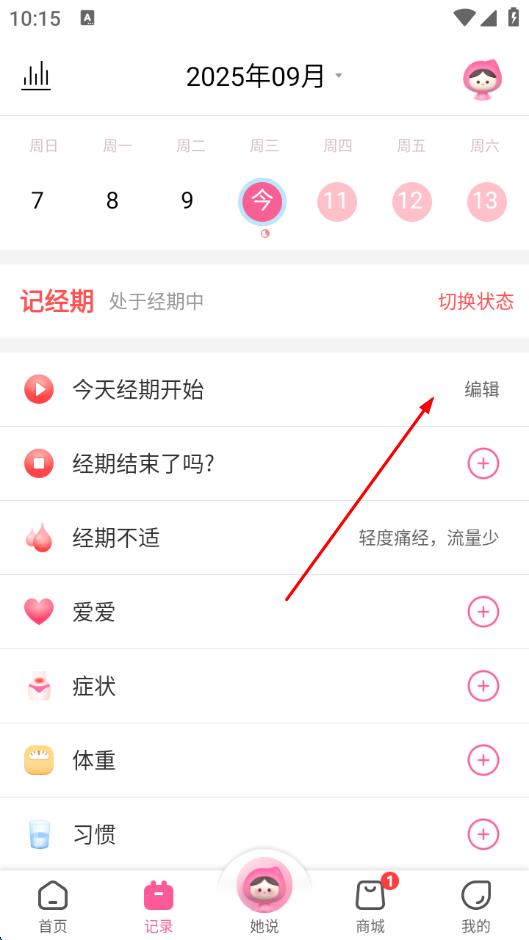 2、在记录页面,找到今天经期开始选项,点击右侧的编辑。