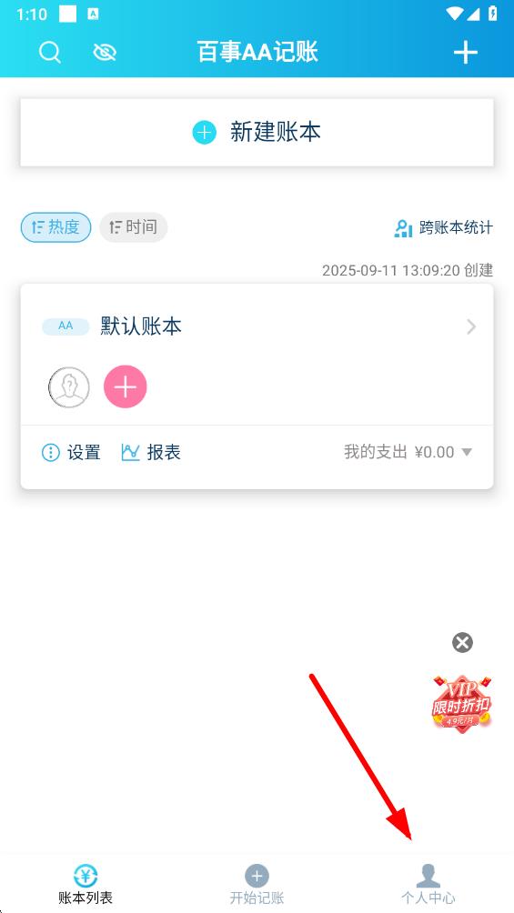 1、打开百事AA记账应用,点击底部导航栏最右侧的个人中心选项,进入个人中心界面。