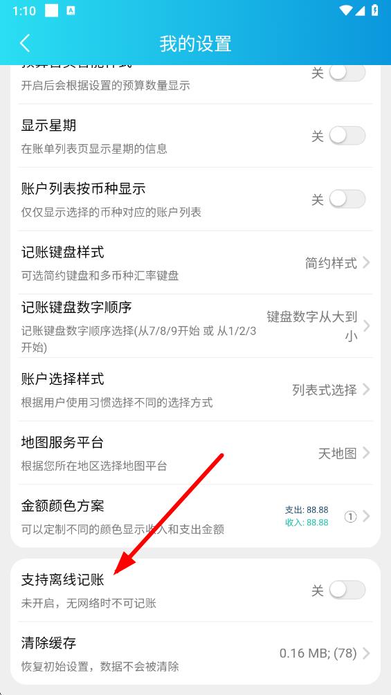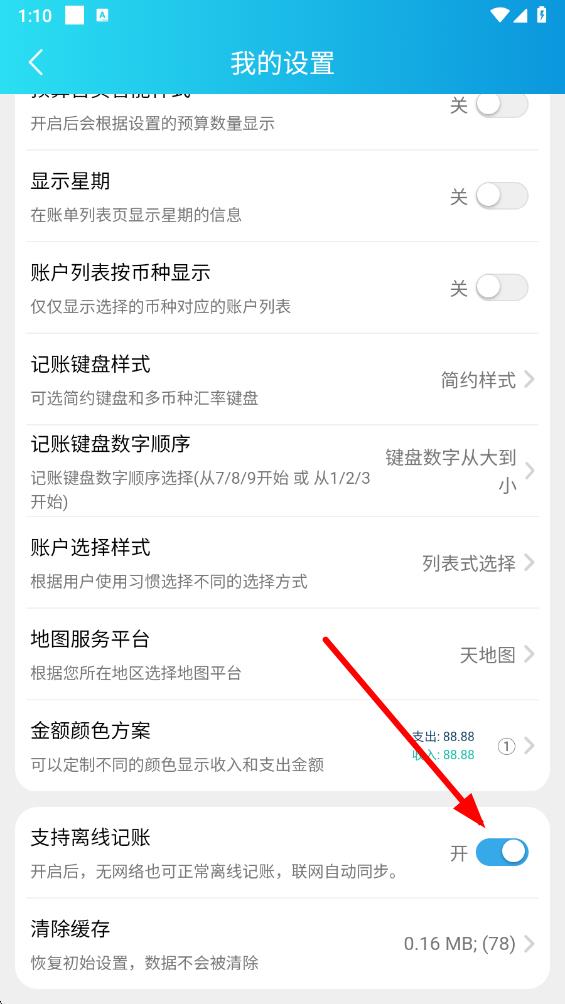 4、点击支持离线记账右侧的开关,将其切换至开启状态,之后在无网络情况下也能正常离线记账,联网后数据会自动同步。