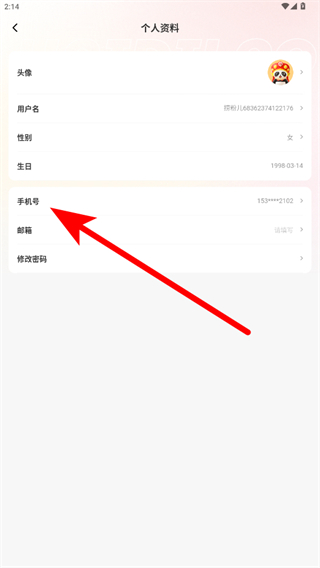 3、在个人资料页面里,点击手机号选项,进入重新绑定手机号界面。