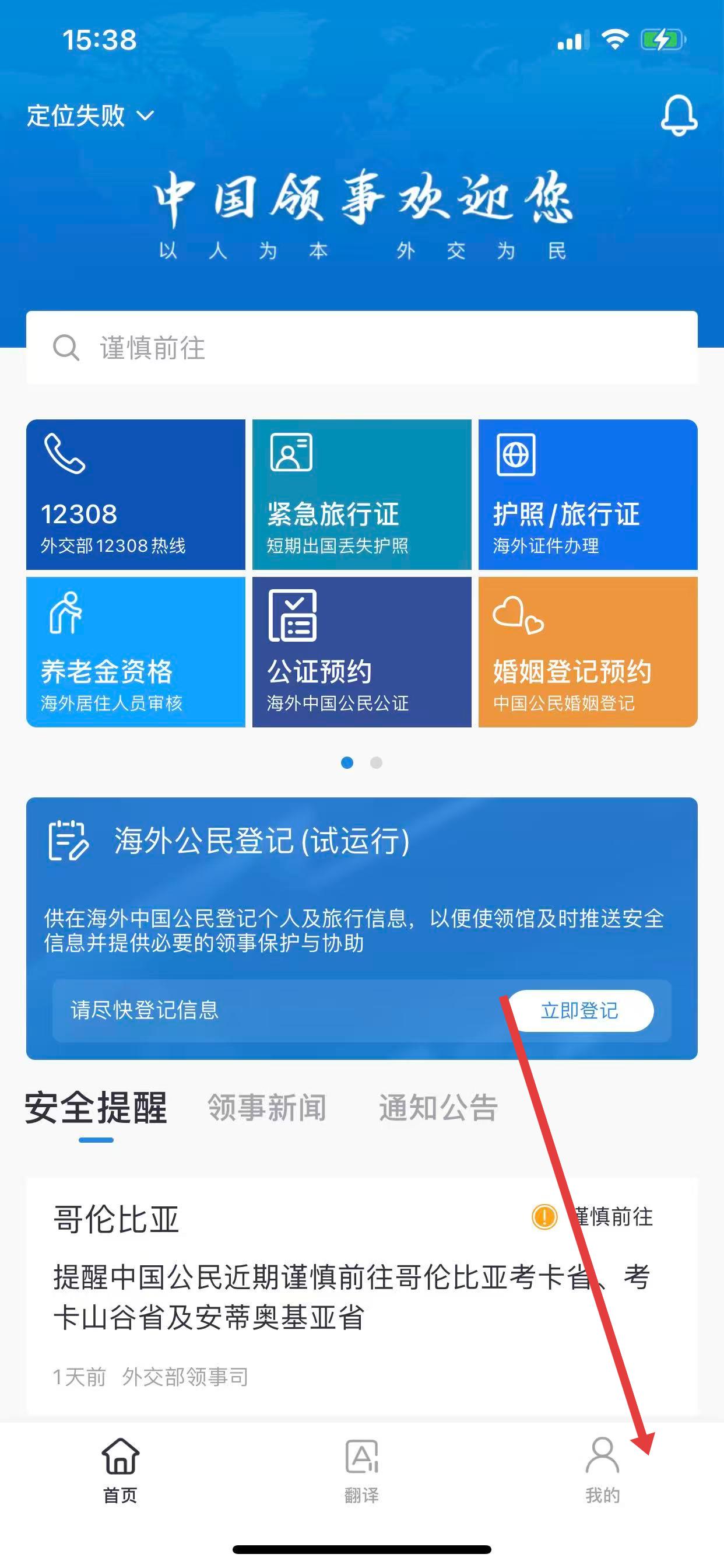 1、打开中国领事APP,点击底部导航栏中的我的。