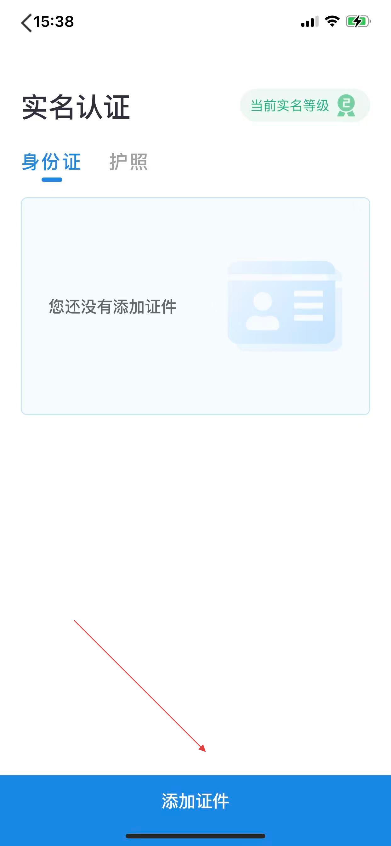3、进入实名认证界面,选择身份证,点击下方添加证件。
