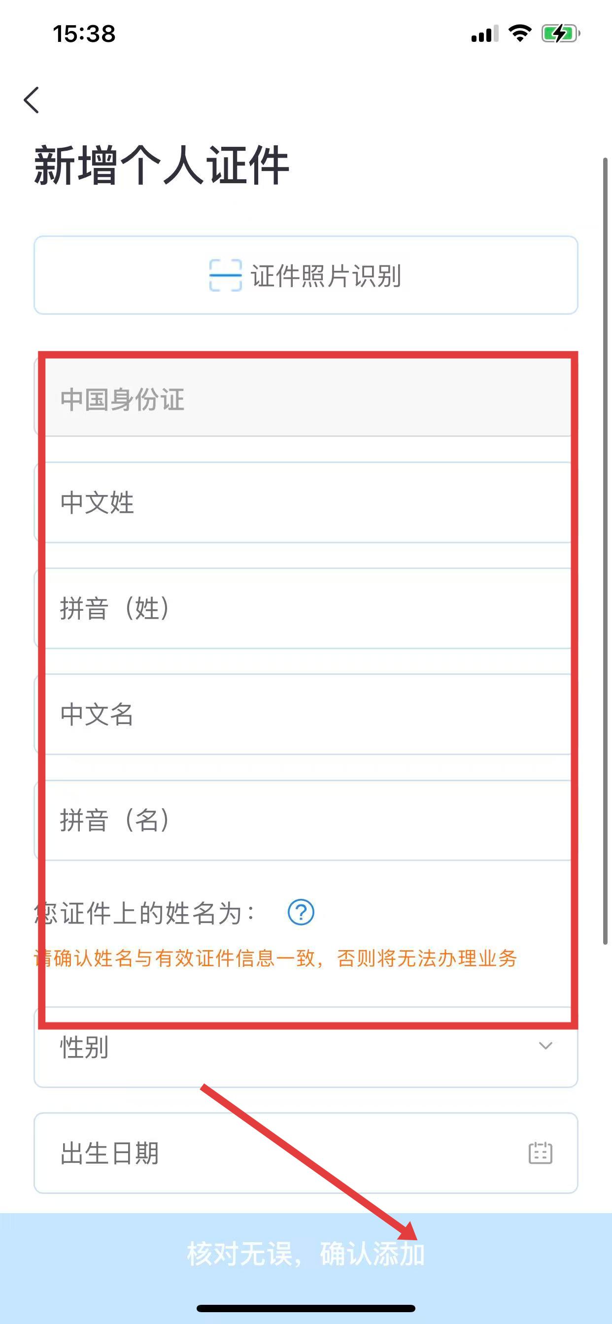4、填写相关身份信息,点击核对无误,确认添加,完成实名认证。