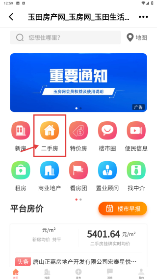 2、在房产服务页面,点击二手房选项,浏览二手房房源列表。