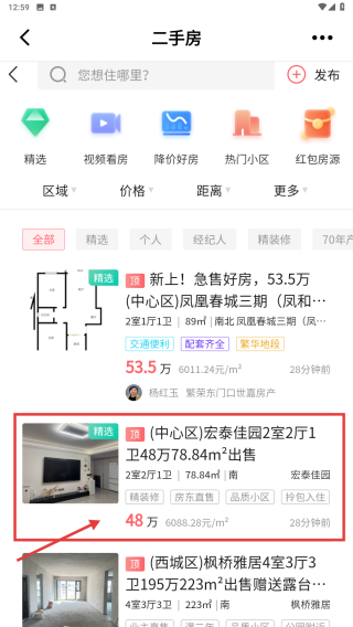 3、在二手房列表里,找到中心区宏泰佳园2室2厅1卫房源条目,点击进入详情。