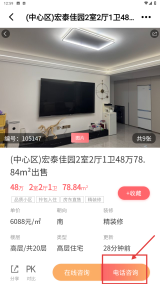 4、在房源详情页,点击电话咨询按钮,发起房源咨询操作。