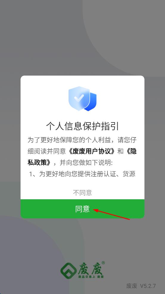 1、打开废废,出现个人信息保护指引提示框,点击同意。