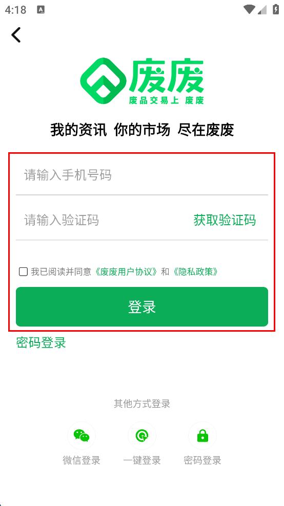 4、在登录页面输入手机号码,点击获取验证码并输入,勾选我已阅读并同意废废用户协议和隐私政策,点击登录。