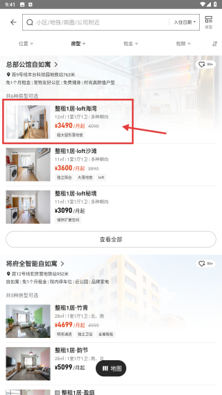 4、在房源列表中,找到整租|居·Ad港湾房源条目¥3499/月起,查看该房源详情。