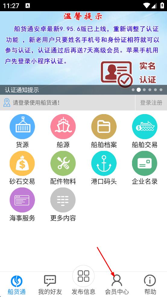 2、在APP主界面下方,找到“会员中心”选项并点击,进入船货通会员登录页面。