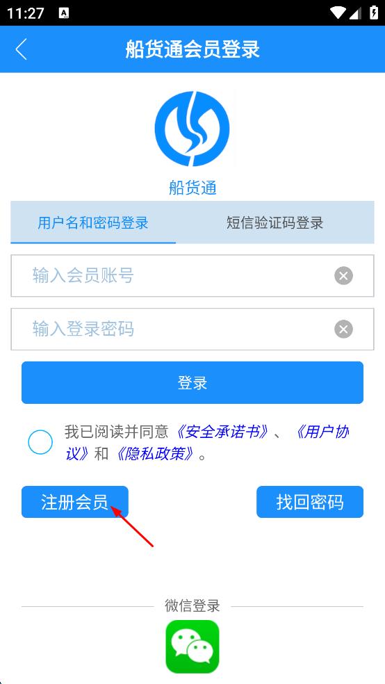 3、在船货通会员登录页面,点击“注册会员”选项,进入注册页面。