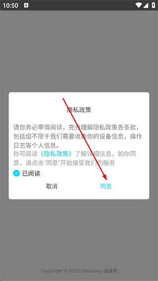 1、打开迪速帮,在弹出的隐私政策页面点击同意。