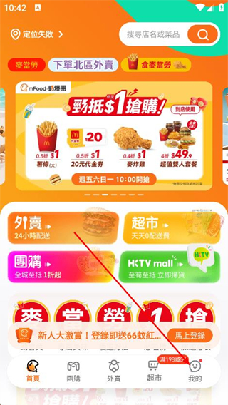 1、打开mfood app,点击底部导航栏最右侧我的选项。
