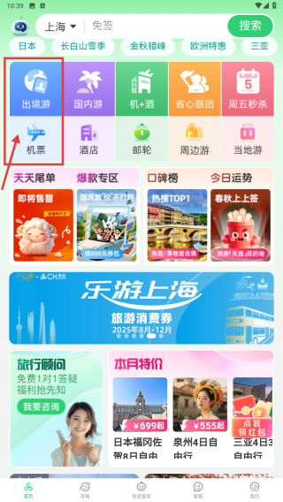 1、打开旅游类应用,点击出境游功能入口,进入出境游页面。