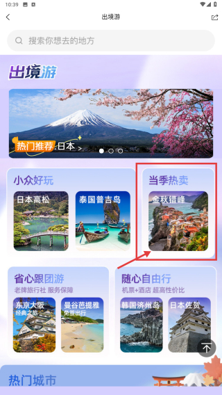 2、在出境游页面,选择金秋错峰主题,进入对应产品列表。